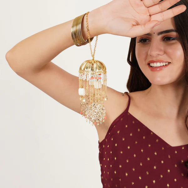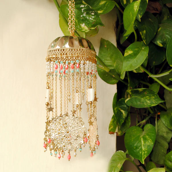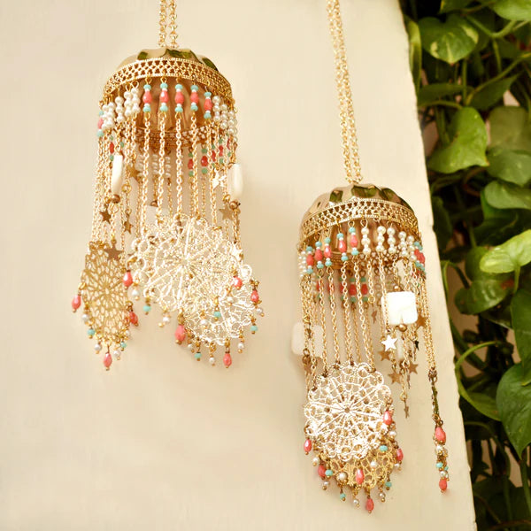 Elevate your bridal ensemble with our Beautiful Dainty Bridal Kaleera, a stunning creation by Jai Ho India designed for the ultra-modern bride. These mini kaleera feature golden disks adorned with beads and pearls, exuding sophistication and charm. Delicate twinkling stars dangle gracefully from all along its circumference, adding a touch of whimsy and elegance to your wedding attire.