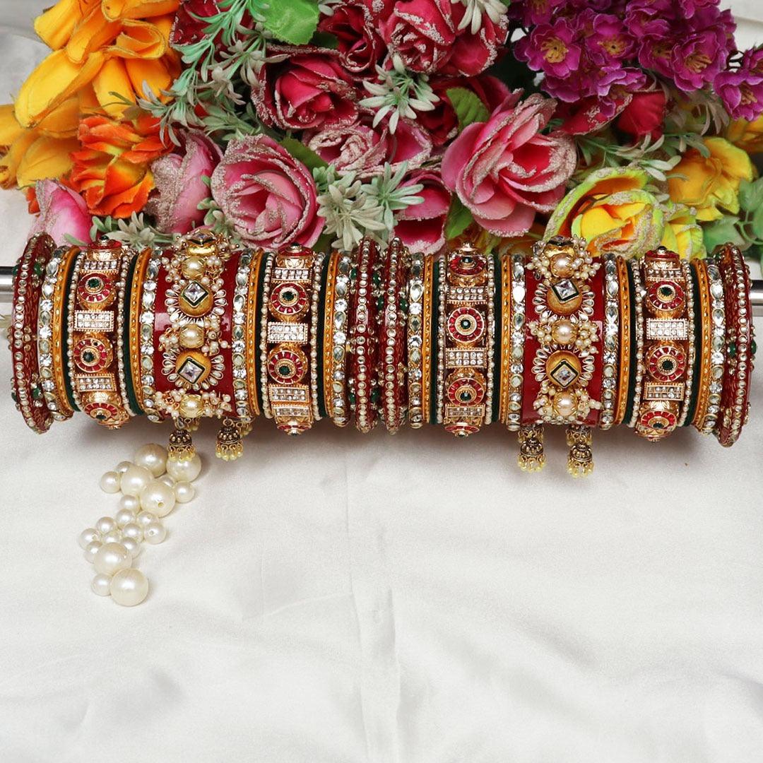 A chooda is a set of traditional bangles worn by brides in Punjabi culture, symbolizing marital happiness and fertility. The red and white colors of the chooda represent prosperity and well-being, while the charms and stones add a touch of elegance and tradition to the bride's ensemble. The Exclusive Punjabi Bridal Choodas With Charms Wedding Bangles Set from Jai Ho India embodies the rich cultural heritage and beauty associated with Punjabi weddings.
